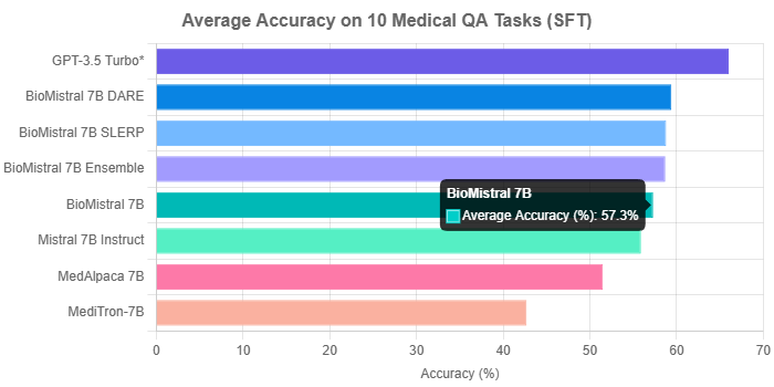 Against proprietary models, the gap remains. GPT-3.5 Turbo, without any specific supervised fine-tuning for this benchmark, achieved an average score of 66.0%, outperforming all BioMistral variants. This highlights that while open-source models are rapidly closing the gap, larger, proprietary models still often maintain a performance advantage.