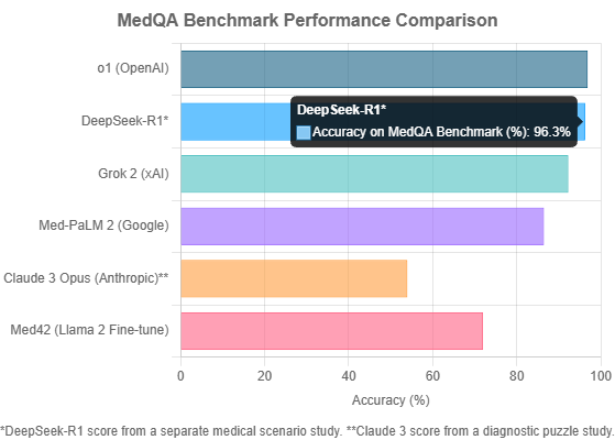 The “J.A.R.V.I.S.” for Clinicians. Released during the 2025 Chinese Spring Festival, DeepSeek-R1 has been hailed as a “J.A.R.V.I.S. moment” for medicine. Its strength lies not just in high accuracy (a study reported 96.3% on medical scenarios), but in its design for practical clinical application. As an open-source model with a permissive MIT license, it allows for deep, local integration into hospital systems. It excels at automating documentation, synthesizing patient histories, and empowering patients by translating complex medical information, representing a holistic approach to augmenting the clinical workflow.