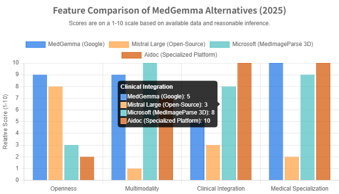 The “best” alternative to MedGemma is entirely dependent on the user’s needs. The chart below visualizes the key differences between MedGemma and some of its top alternatives across four critical dimensions: openness, multimodality, clinical integration, and medical specialization.