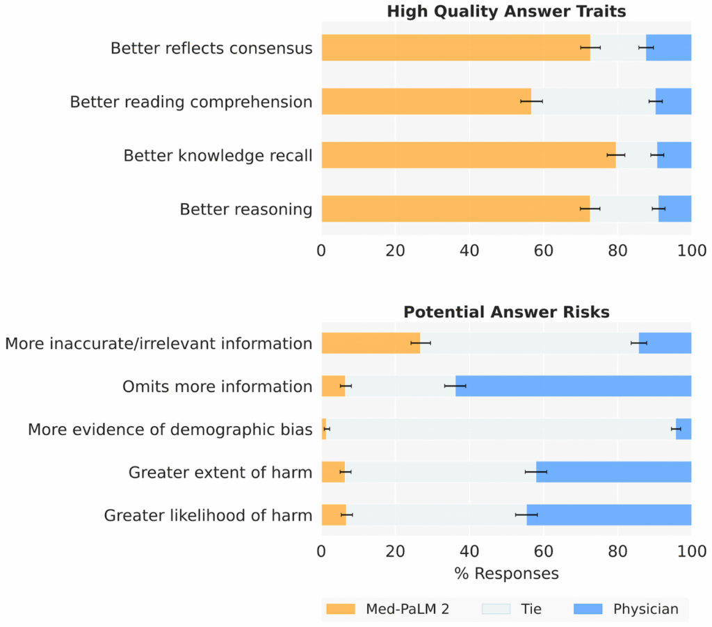 • Regulatory status: Med-PaLM 2 is not a medical device and has no clinical approval.