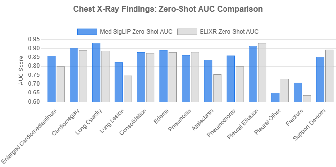 The official documentation provides a direct comparison of MedSigLIP’s zero-shot Area Under the Curve (AUC) scores against ELIXR, another prominent model. The results are particularly impressive given that MedSigLIP operates on 448×448 images, while ELIXR uses a much higher 1280×1280 resolution.
