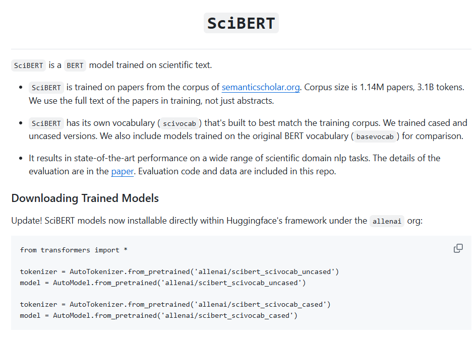 • SciBERT: Trained on Semantic Scholar: broader scientific domain coverage, solid for classification and tagging tasks (SciBERT: model card: AllenAI).