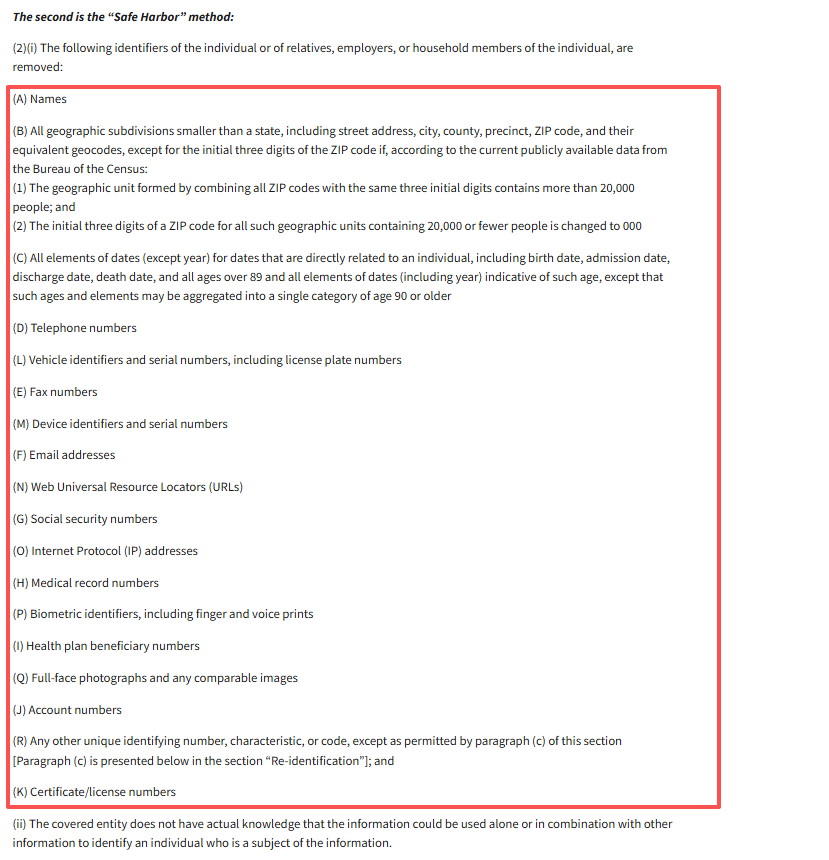 • Remove/obfuscate direct identifiers (names, MRNs, SSNs, phone numbers, addresses) and quasi-identifiers (dates, small geo areas) via tools like Philter plus custom regex and dictionary checks. Keep an expert-in-the-loop review for edge cases. HIPAA requires either Safe Harbor (removal of 18 identifier types) or Expert Determination (formal privacy expert attestation that re-identification risk is very small). Refer to HHS guidance on de-identification methods for comprehensive requirements.