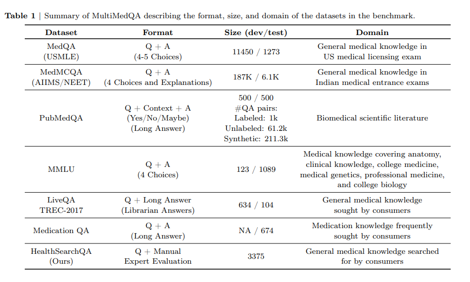 Clinical benchmarks: Consider PubMedQA, MedQA (USMLE-style questions), BioASQ biomedical challenge, and RadGraph F1 for information extraction: but always include site-specific test sets reflecting your actual workflows, patient populations, and EHR systems. External benchmarks may not reflect real-world performance. The MultiMedQA benchmark provides comprehensive evaluation across multiple medical tasks.