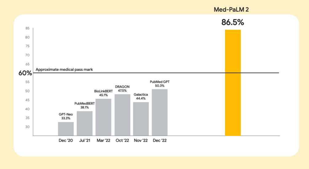 - Med-PaLM 2: MedQA 86.5%: PubMedQA 81.8%. Expert-level clinical reasoning: limited access.